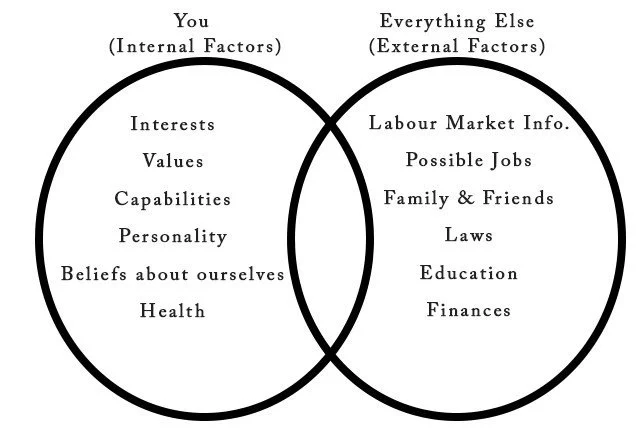 Self-reflection can feel overwhelming if we ask too big a question; we only succeed in making ourselves anxious, discouraged, and coping with Netflix and ice cream. By asking unstructured questions like what what is the meaning of my life (an unhelpful and surprisingly modern question created Thomas Carlyle and German romantics in the 1800’s), we can easily paralyze ourselves in endless reflection, so some structure is important. When making a career decision, we need to consider both Internal and External factors. Internal factors can be examined through self-reflection and include things like our interests, hobbies, health, and personal values. External factors including information on specific jobs, societal forces, family and friends, among others. By considering both, we can feel greater confidence in our career decision.